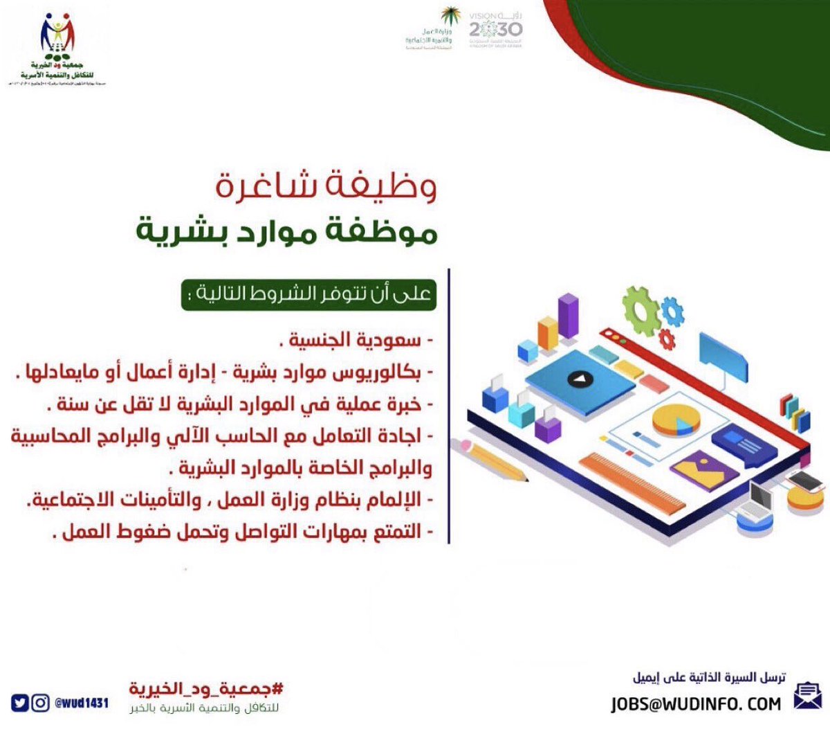 أعلنت جمعية ود الخيرية للتكافل والتنمية الأسرية توفر وظيفة إدارية شاغرة بالخبر، للعمل بمسمى (موظفة موارد بشرية)، وذلك وفقاً للتفاصيل الموضحة أدناه.