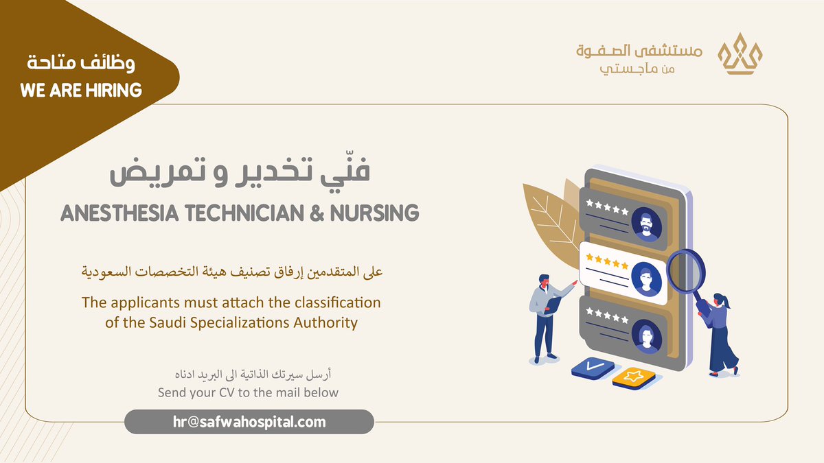 أعلن مستشفى الصفوة من ماجستي توفر وظائف صحية شاغرة بمدينة الرياض، للعمل بمسمى (فنّي تخدير، وتمريض)، وذلك وفقاً للتفاصيل وطريقة التقديم الموضحة أدناه.