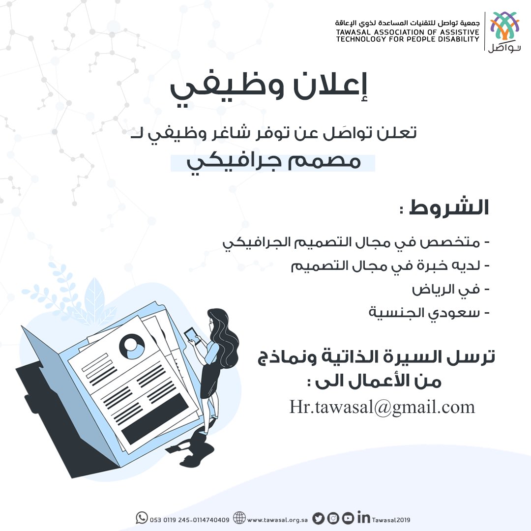 أعلنت جمعية تواصل للتقنيات المساعدة لذوي الإعاقة بمدينة الرياض توفر وظيفة شاغرة بمجال تصميم الجرافيك بمدينة الرياض، واشترطت الجمعية أن يكون المتقدم سعودي الجنسية، وذلك وفقاً للتفاصيل وطريقة التقديم الموضحة أدناه.