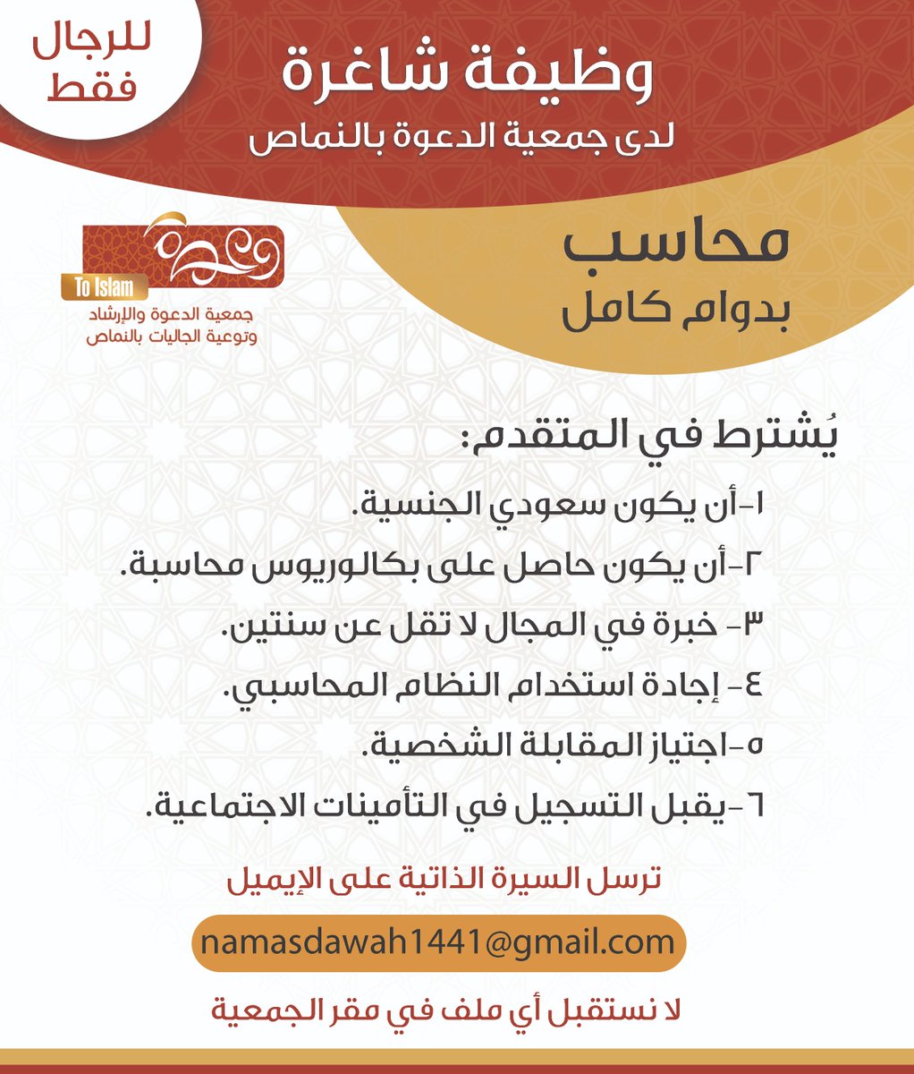 جمعية الدعوة بالنماص توفر وظيفة إدارية بدوام كامل لحملة البكالوريوس