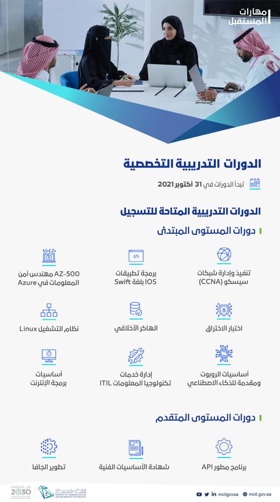 أعلنت وزارة الاتصالات وتقنية المعلومات دورات تدريبية ضمن مبادرة مهارات المستقبل (عن بُعد) بمسارات تقنية متعددة، يتضمن التدريب شهادات اجتياز ودورات في مجالات رقمية متنوعة، وذلك وفقاً للتفاصيل وطريقة التسجيل الموضحة أدناه.