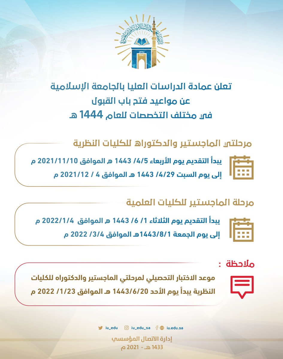 أعلنت الجامعة الإسلامية مُمثلة في عمادة الدراسات العليا عن مواعيد فتح باب القبول في مختلف التخصصات للعام 1444هـ، بعدد 46 برنامج (دبلوم عالي / ماجستير / دكتوراه) للكليات النظرية والعلمية، وذلك وفقاً للتفاصيل الموضحة أدناه.