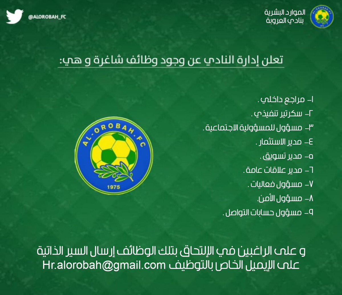 نادي العروبة السعودي بالجوف يوفر 9 وظائف شاغرة في عدة مجالات وظيفية