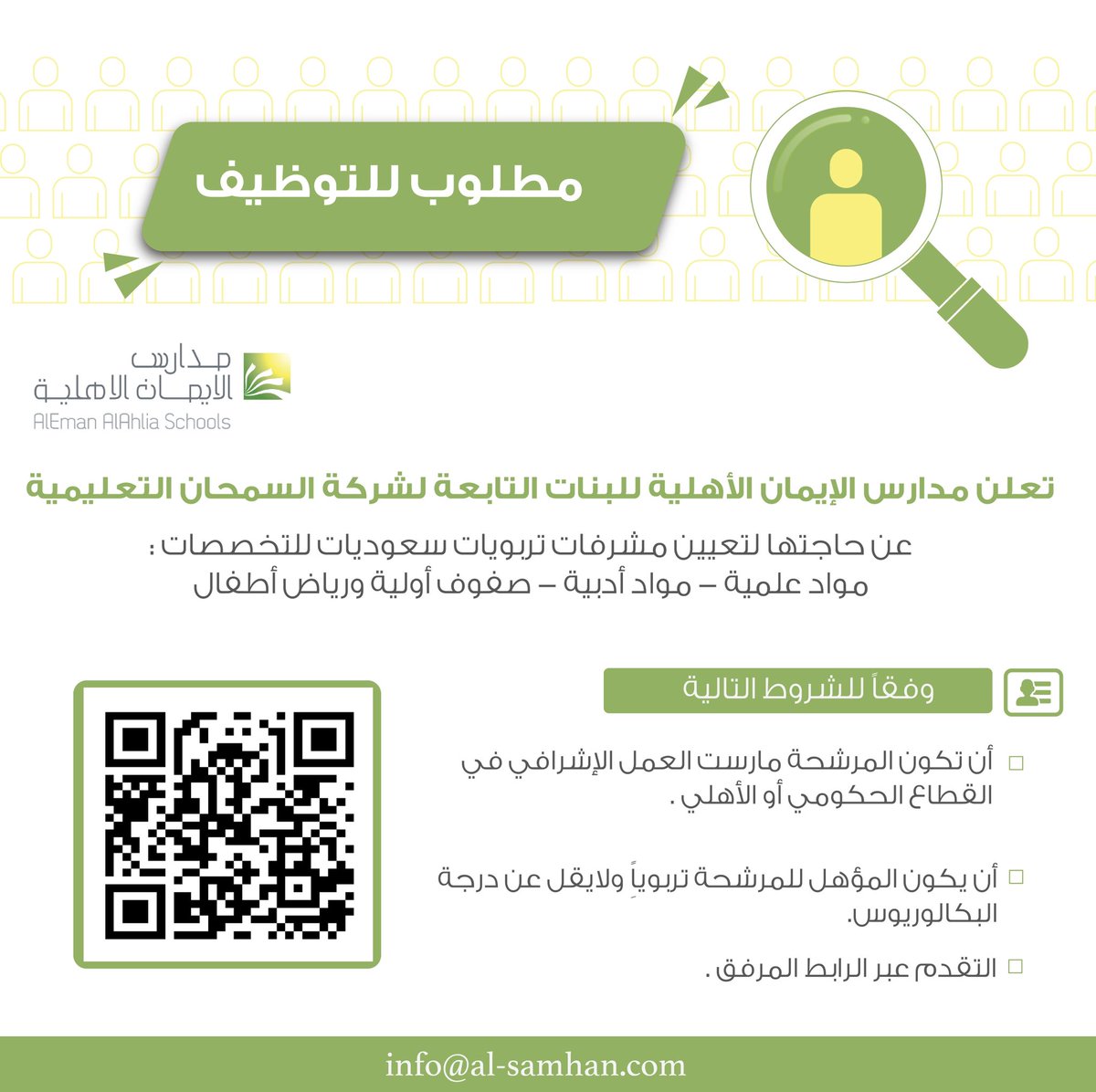 مدارس الإيمان الأهلية للبنات بالدمام توفر وظائف مشرفات تربويات في عدة تخصصات