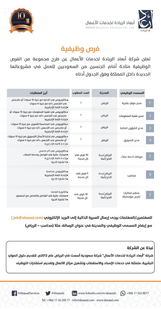 تعلن أبعاد الريادة لخدمات الأعمال توفر أكثر من 25 وظيفة في (الرياض – جدة – الخبر – ابها)، وذلك وفقاً للتفاصيل الواردة أدناه.