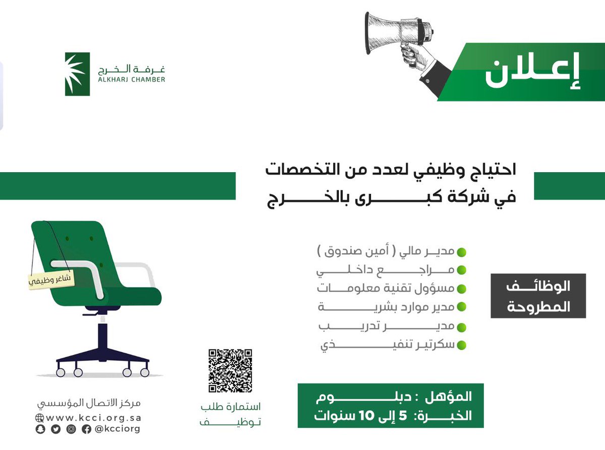 غرفة الخرج تعلن توفر وظائف إدارية ومالية وتقنية في (شركة كبرى)