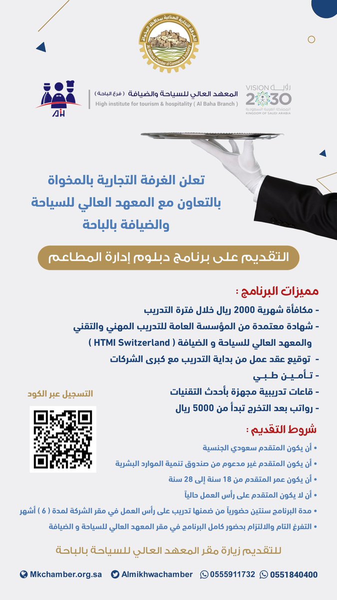 أعلنت غرفة المخواة بالتعاون مع المعهد العالي للسياحة والضيافة بالباحة عن بدء التسجيل في (برنامج دبلوم إدارة المطاعم) المبتدئ بالتوظيف، برواتب تبدأ بعد التخرج 5,000 ريال، وذلك وفقاً للتفاصيل الموضحة أدناه.