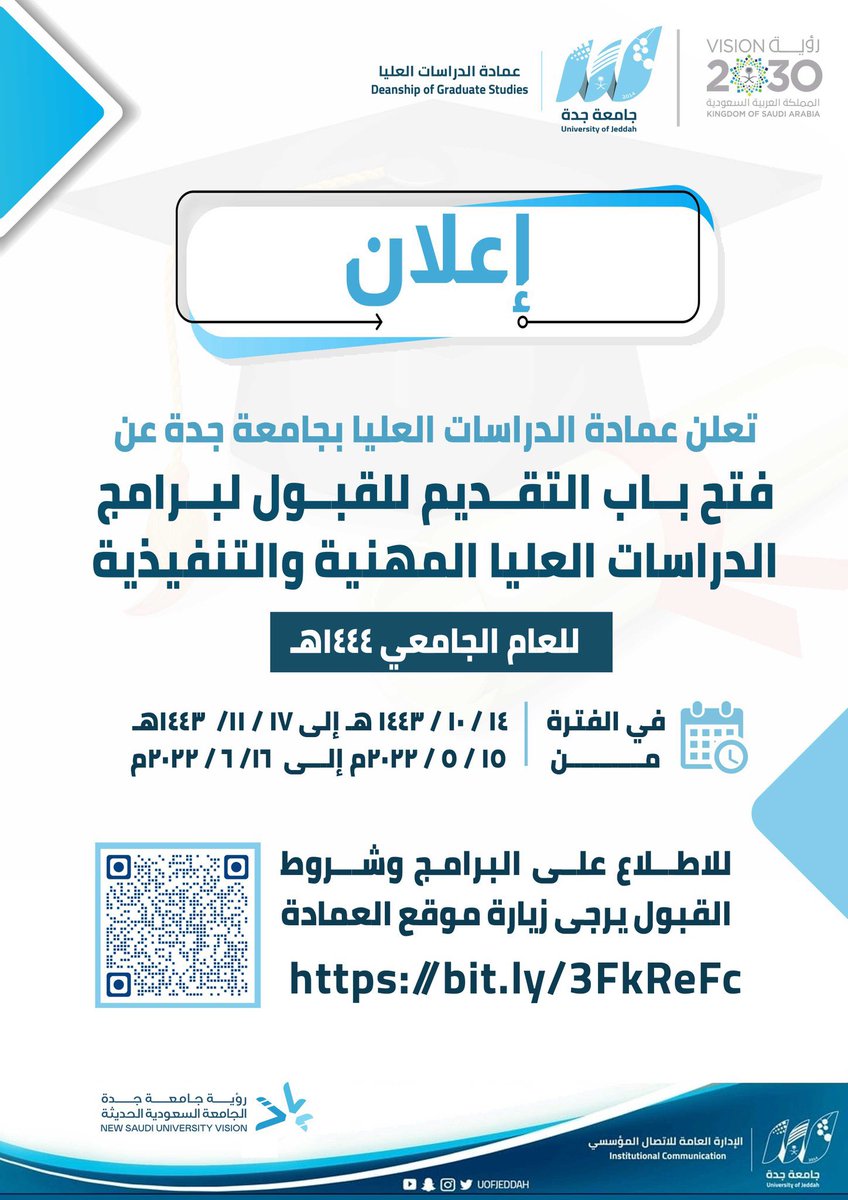 أعلنت جامعة جدة مُمثلة في عمادة الدراسات العليا موعد فتح التقديم في برامج الدراسات العليا (المهنية والتنفيذية) للعام الجامعي 1444هـ، وذلك وفقاً للتفاصيل وطريقة التقديم الموضحة أدناه.