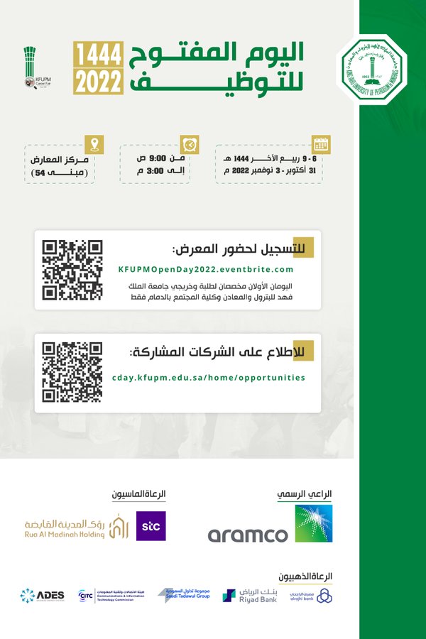 جامعة الملك فهد للبترول والمعادن تعلن موعد إقامة (اليوم المفتوح للتوظيف) برعاية رسمية من أرامكو