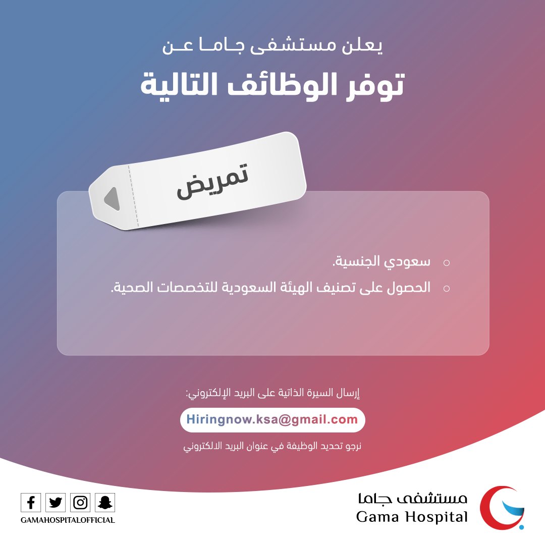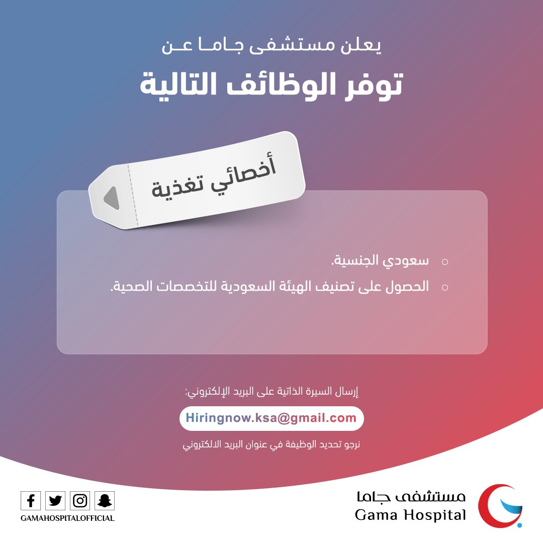 مستشفى جاما يعلن فتح التوظيف للوظائف الإدارية والصحية والطبية بالمنطقة الشرقية.
