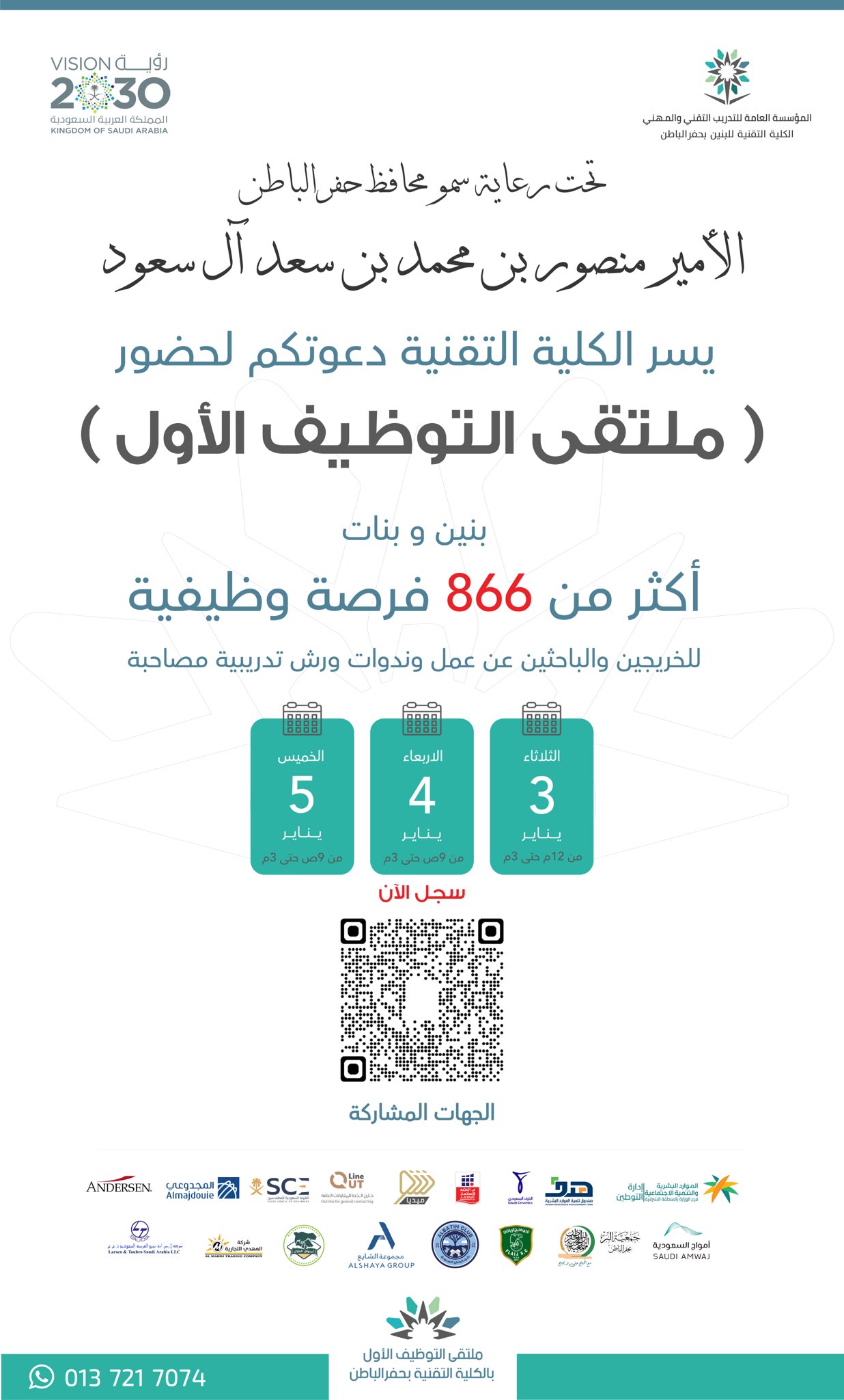 الكلية التقنية للبنين بحفر الباطن تعلن 866 وظيفة عبر (ملتقى التوظيف الأول)
