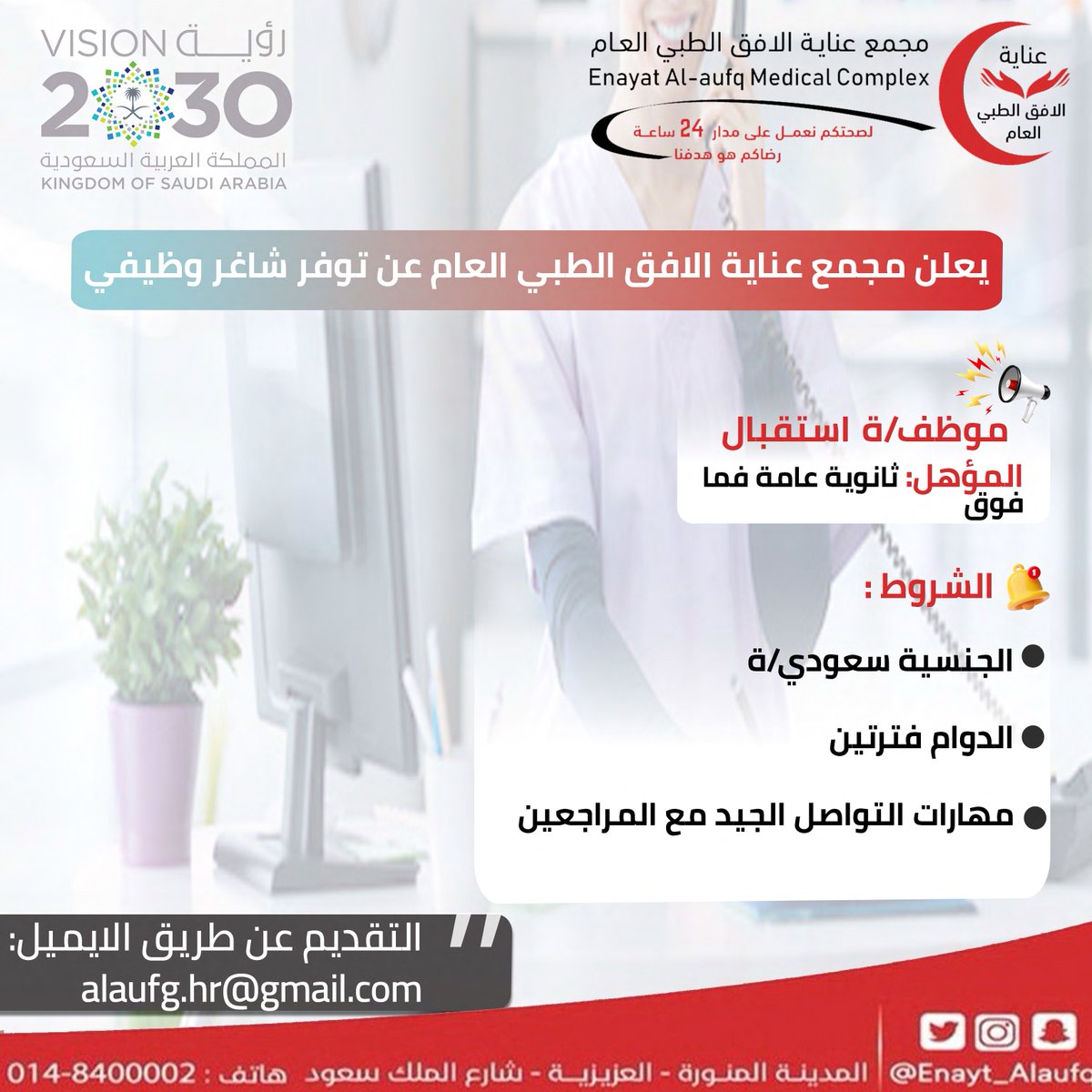 أعلن مجمع عناية الأفق الطبي العام بالمدينة المنورة توفر وظائف لحملة الثانوية فأعلى، وذلك وفقاً للتفاصيل وطريقة التقديم الموضحة أدناه.