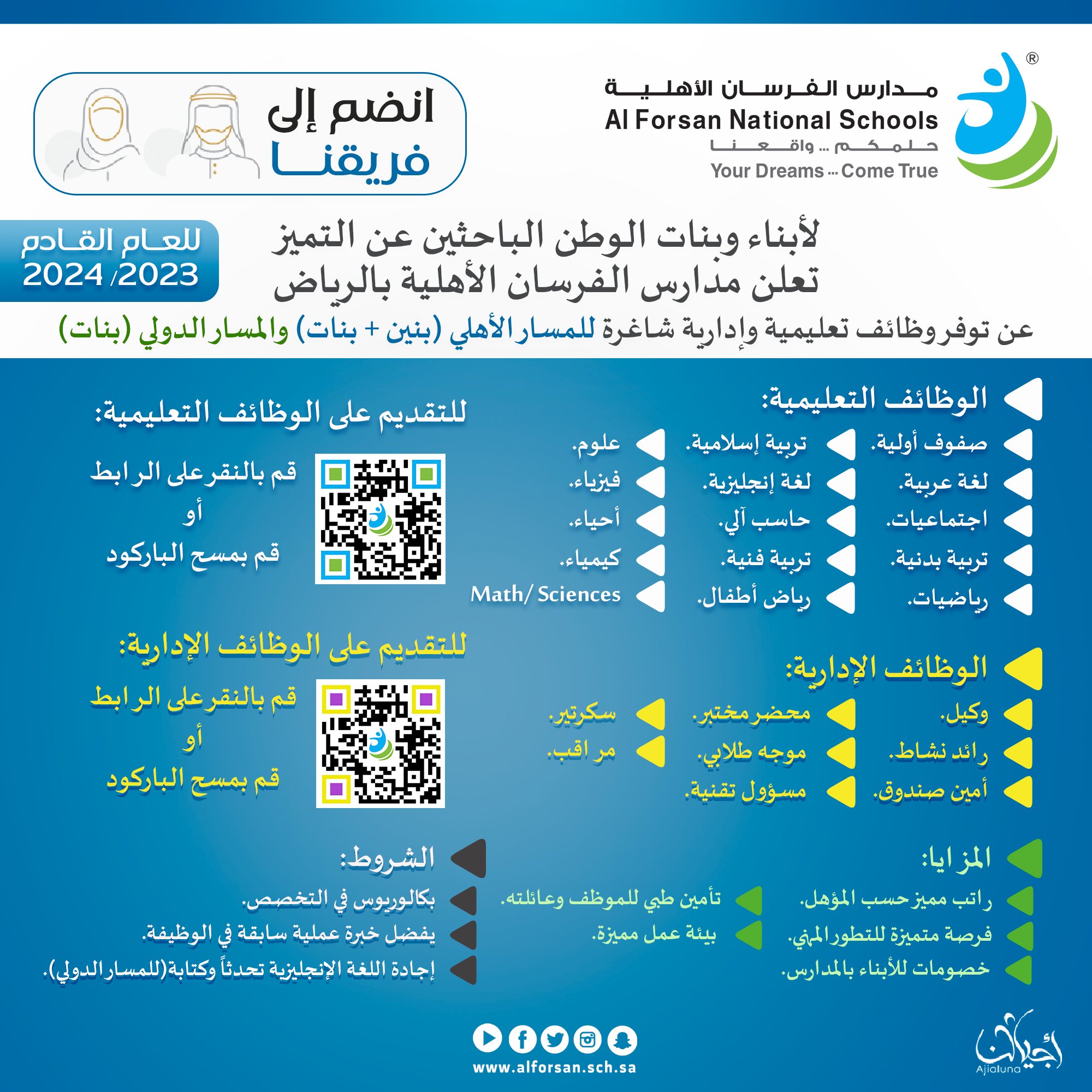 مدارس الفرسان الأهلية بالرياض تعلن فتح التوظيف للوظائف التعليمية والإدارية