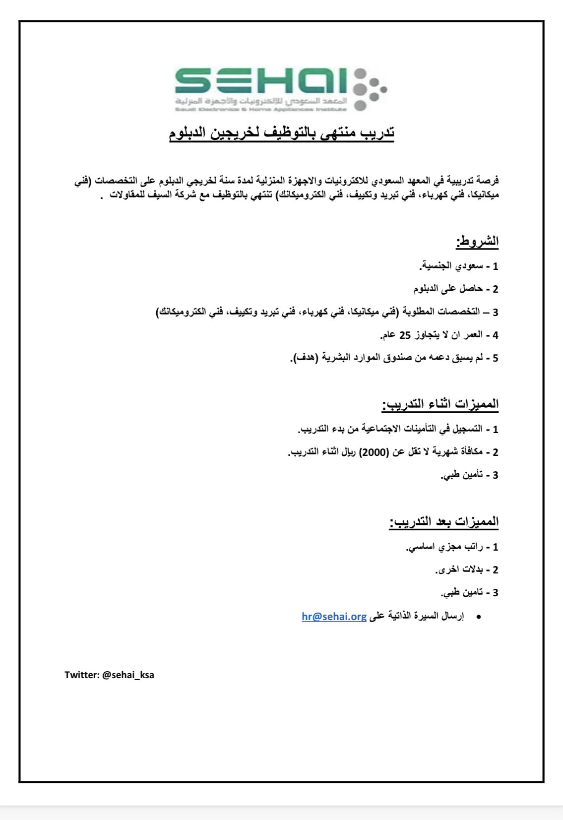 أعلن المعهد السعودي للإلكترونيات والأجهزة المنزلية (سيهاي) تدريب منتهي بالتوظيف لخريجي الدبلوم للعمل مع شركة السيف للمقاولات، وذلك وفقاً للتفاصيل الموضحة أدناه.