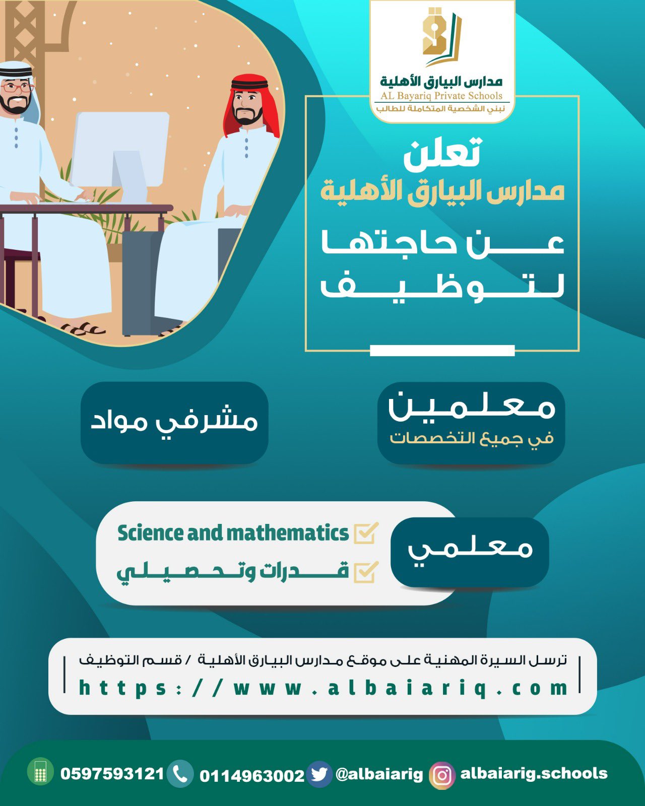 مدارس البيارق الأهلية بالرياض توفر وظائف تعليمية في (جميع التخصصات)