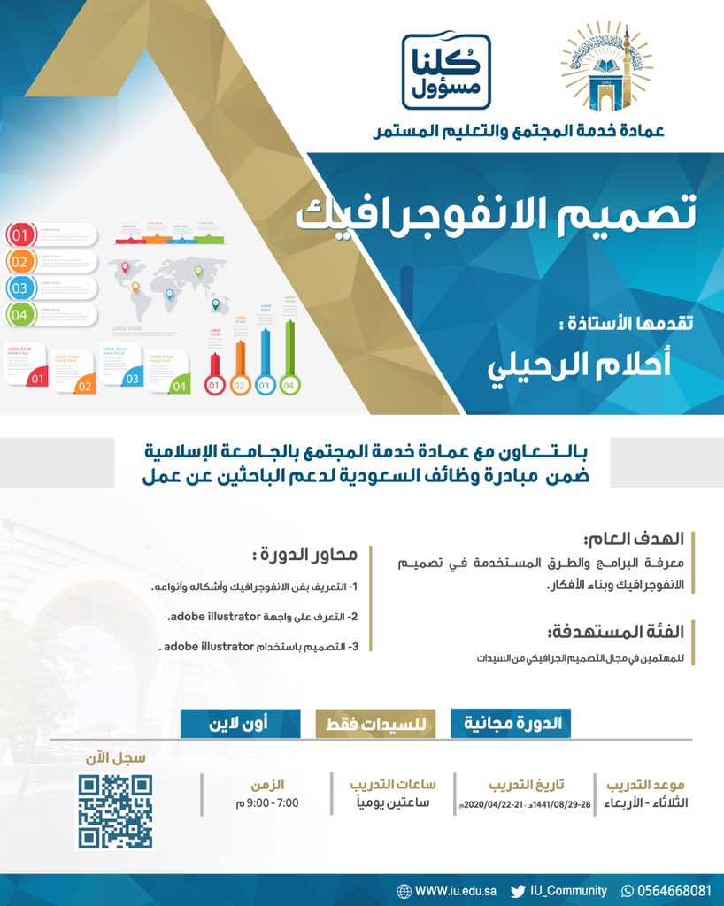 أعلنت الجامعة الإسلامية مُمثلة في عمادة خدمة المجتمع والتعليم المُستمر دورة تدريبية مجانية (للنساء فقط)، بمجال تصميم الانفوجرافيك (عن بعد)، وتهدف الدورة لمعرفة البرامج والطرق المستخدمة في تصميم الانفوجرافيك وبناء الأفكار، وذلك وفقاً للتفاصيل الموضحة أدناه.