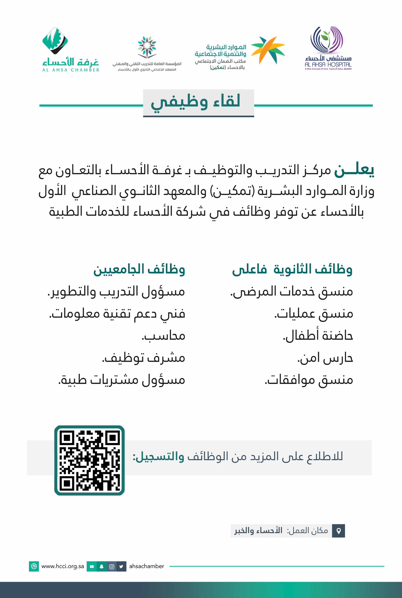 يعلن مركز التدريب والتوظيف بـ غرفة الأحساء بالتعاون مع وزارة الموارد البشرية (تمكين) والمعهد الثانوي الصناعي الأول بالأحساء عن توفر وظائف في شركة الأحساء للخدمات الطبية للعمل في (الأحساء والخبر).