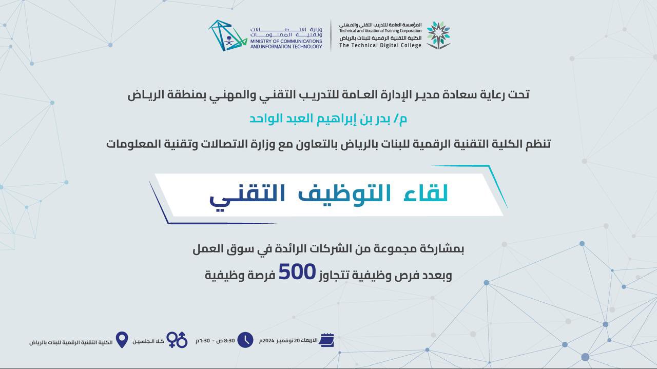 أعلنت الكلية التقنية الرقمية للبنات بالرياض عن أكثر من 500 وظيفة (للجنسين) عبر لقاء وظيفي تقني، وذلك وفقاً للتفاصيل وطريقة التقديم الموضحة أدناه.