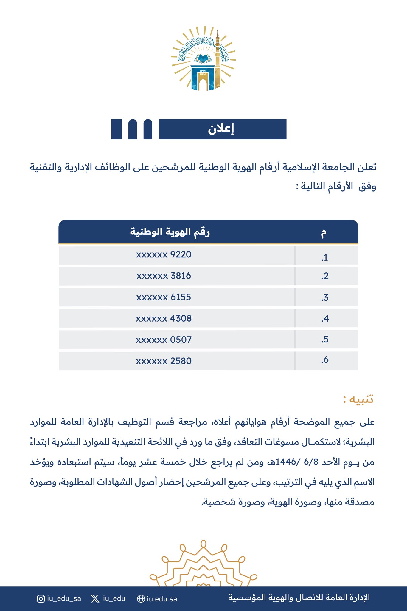 - على جميع الموضحة أرقام هواياتهم أعلاه، مراجعة قسم التوظيف بالإدارة العامة للموارد البشرية؛ لاستكمال مسوغات التعاقد، وفق ما ورد في اللائحة التنفيذية للموارد البشرية ابتداء من يوم الأحد 1446/06/08هـ ومن لم يراجع خلال خمسة عشر يوماً، سيتم استبعاده ويؤخذ الاسم الذي يليه في الترتيب، وعلى جميع المرشحين إحضار أصول الشهادات المطلوبة، وصورة مصدقة منها، وصورة الهوية، وصورة شخصية.