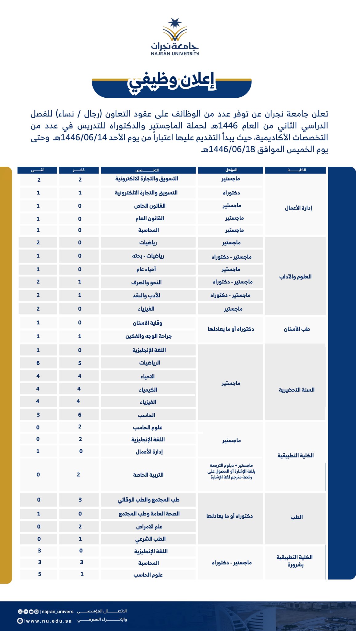 أعلنت جامعة نجران عن توفر وظائف أعضاء هيئة التدريس (رجال/نساء) بنظام التعاون للفصل الدراسي الثاني من العام الجامعي 1446هـ لحملة الماجستير والدكتوراه في عدد من التخصصات الأكاديمية، وذلك وفقًا للتفاصيل وطريقة التقديم الموضحة أدناه.