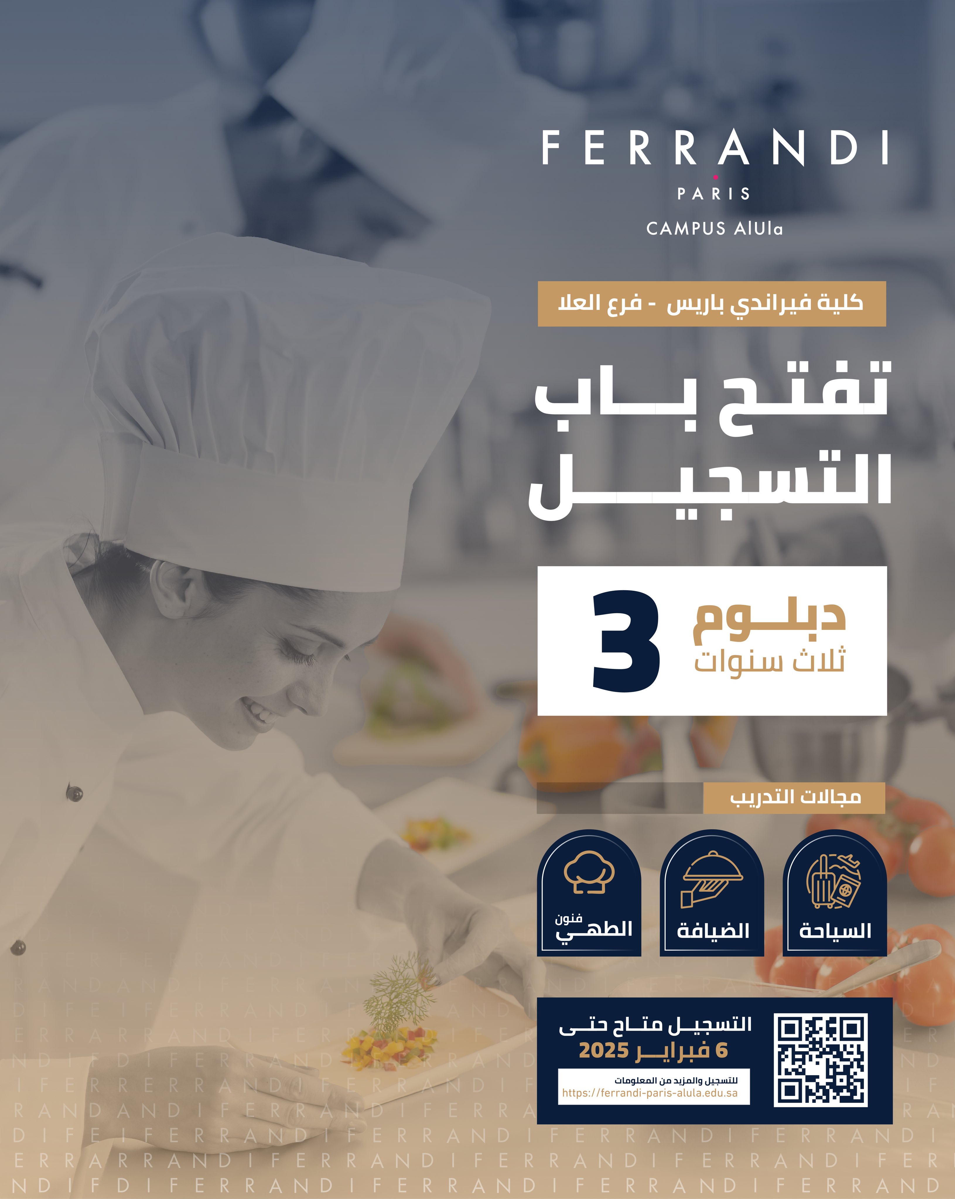 أعلنت كلية فيراندي باريس فرع العلا عن بدء التسجيل في برامج الدبلوم المتخصصة في السياحة والضيافة وفنون الطهي، وذلك وفقاً للتفاصيل الموضحة أدناه.