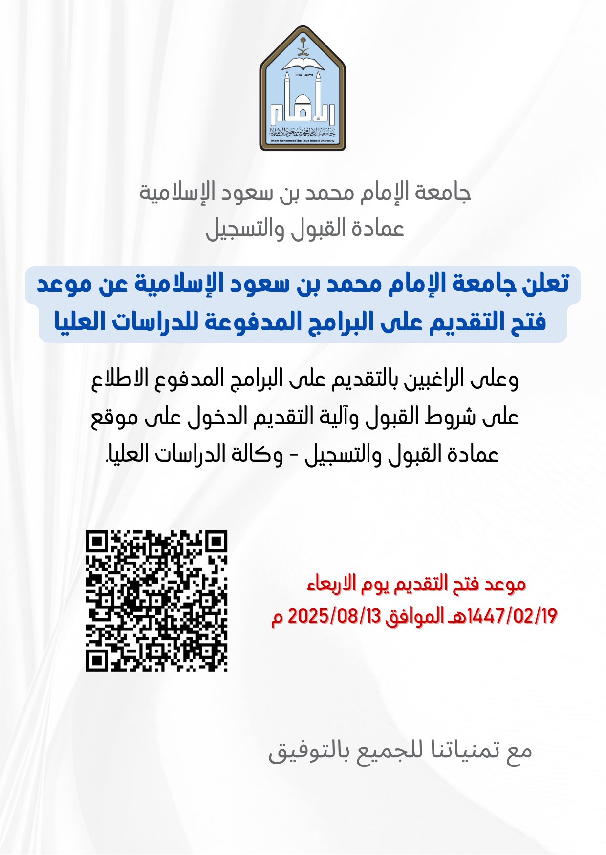 (🔴) جامعة الإمام تعلن فتح القبول لبرامج الدراسات العليا (برسوم دراسية) للعام الجامعي ١٤٤٧هـ