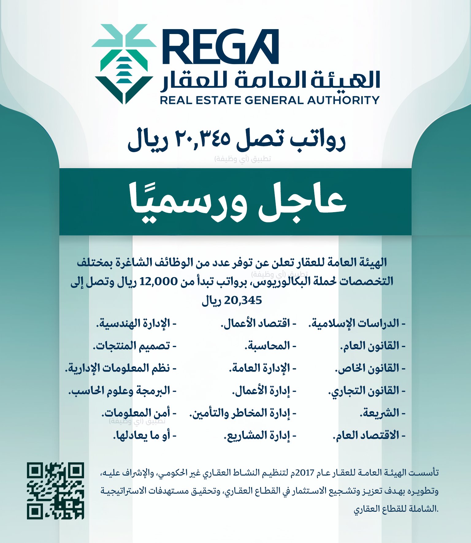 أعلنت الهيئة العامة للعقار عن توفر عدد من الوظائف الشاغرة بمختلف التخصصات لحملة البكالوريوس، برواتب تبدأ من 12,000 ريال وتصل إلى 20,345 ريال، وذلك وفقاً للتفاصيل الموضحة أدناه.