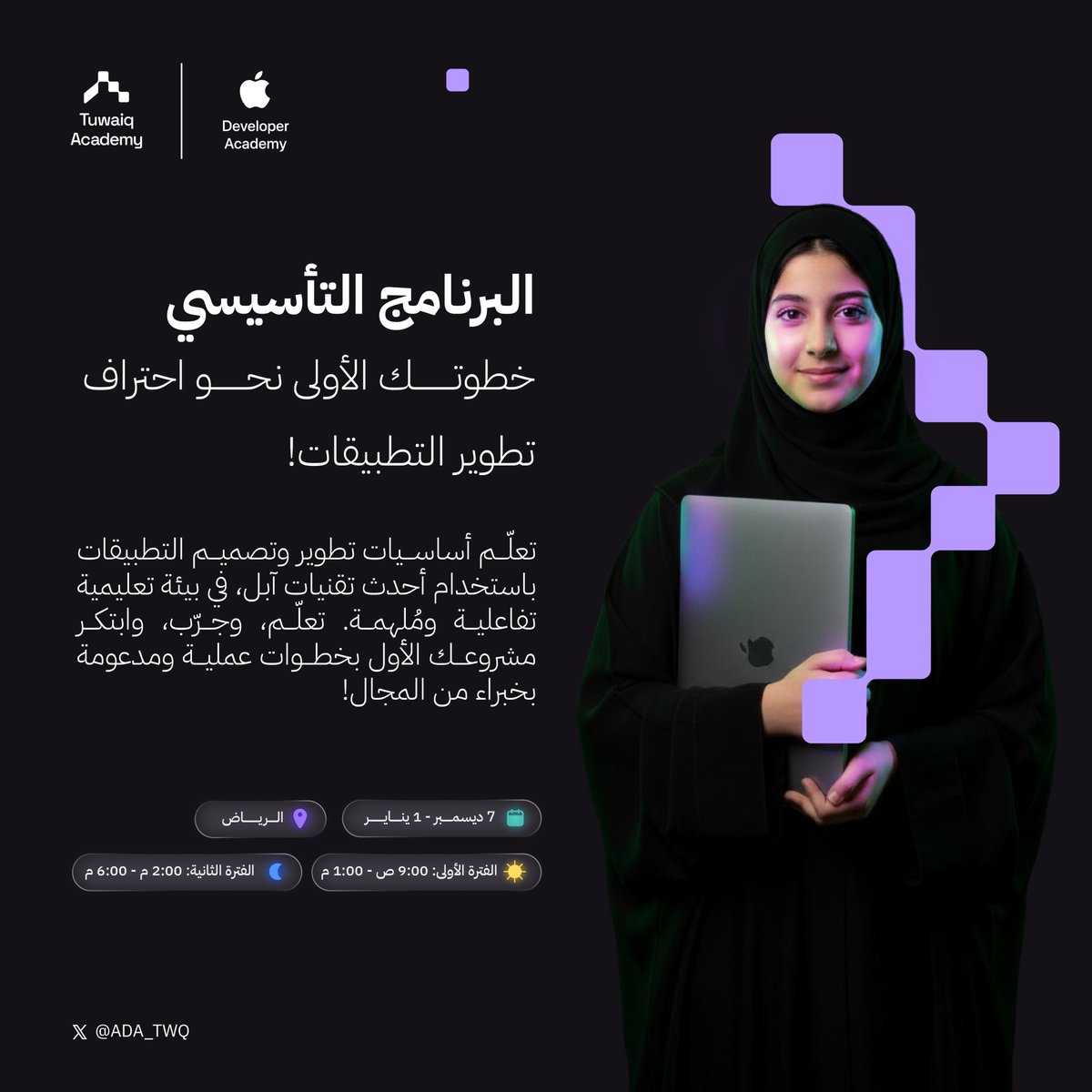 - يهدف البرنامج التأسيسي إلى تعليم أساسيات تطوير وتصميم التطبيقات باستخدام أحدث تقنيات آبل، ويوفر تجربة تعليمية تفاعلية وملهمة، حيث يمكن للمشاركات تعلم وتجربة وابتكار مشروعهن الأول بخطوات عملية ومدعومة بخبراء من المجال.