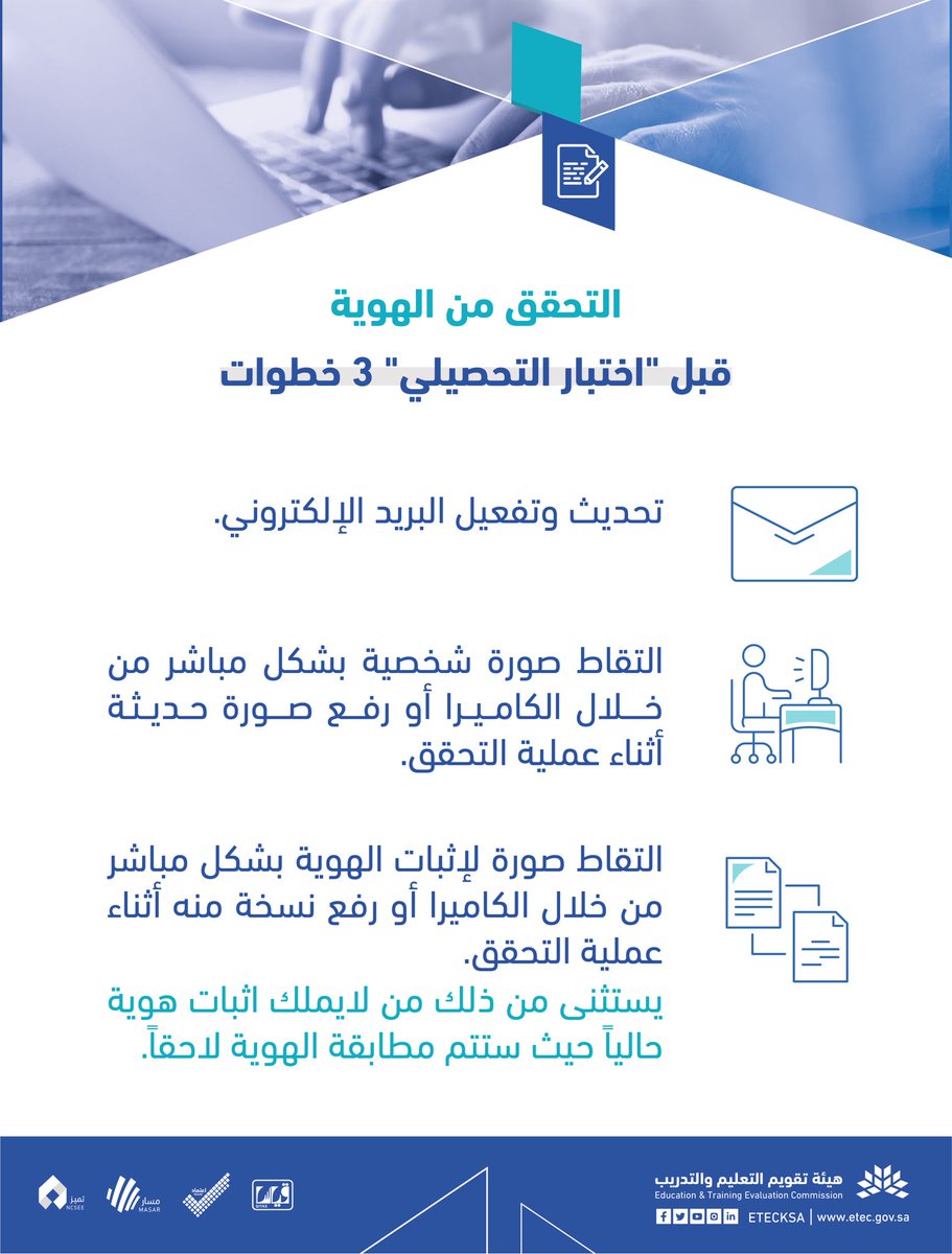 أعلنت هيئة تقويم التعليم والتدريب ثلاث خطوات قبل التحصيلي (عن بُعد)، من ضمنها (تحديث وتفعيل البريد الإلكتروني)، وذلك وفقاً للتفاصيل الموضحة أدناه.