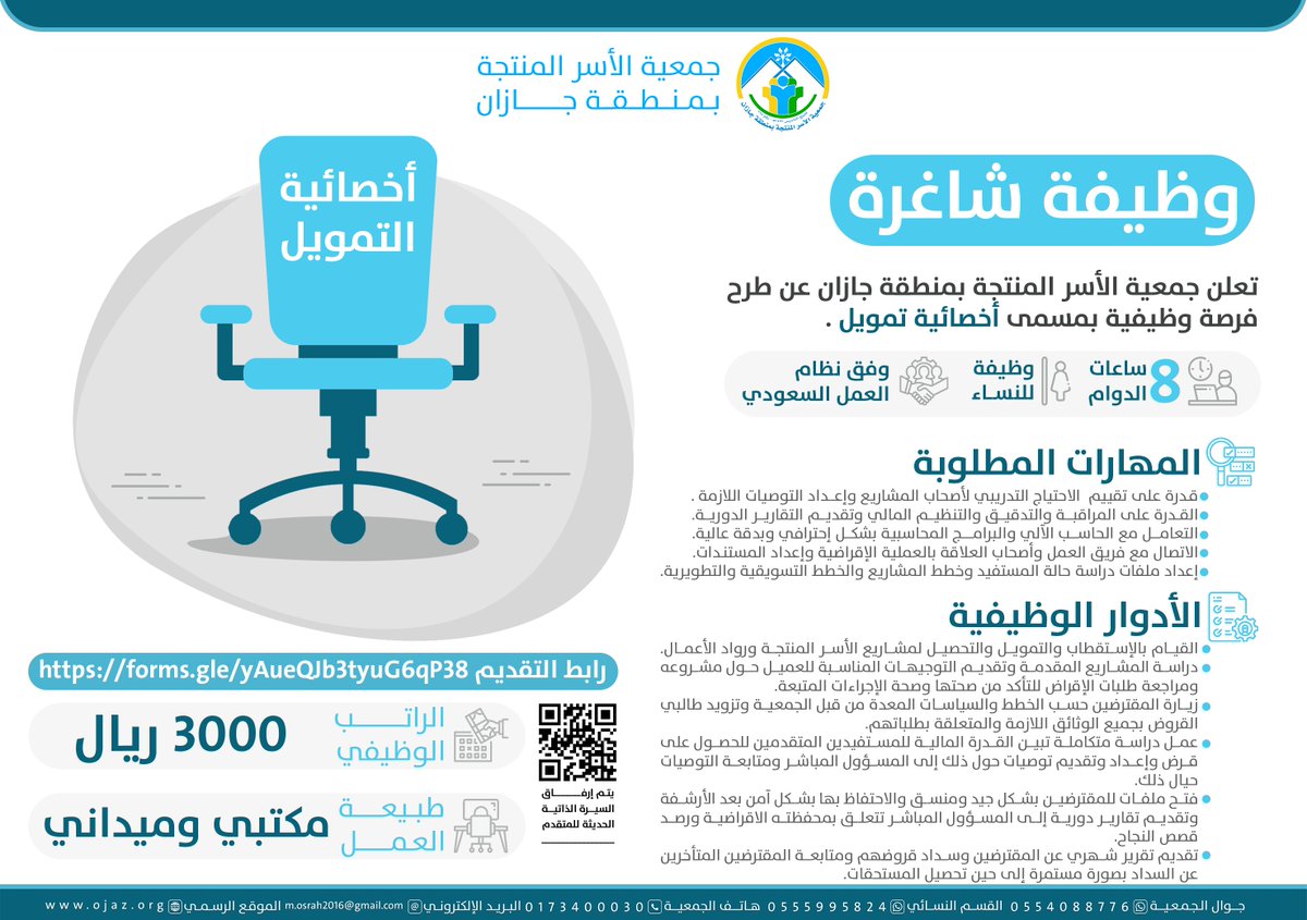 أعلنت جمعية الأسر المنتجة بمنطقة جازان توفر وظائف شاغرة (للرجال والنساء)، للعمل بالجمعية بالمسميات التالية (أخصائية التمويل، ومحاسب، ومساعد إداري، ومشرفة القسم النسائي)، وذلك وفقاً لطريقة التقديم الموضحة أدناه.