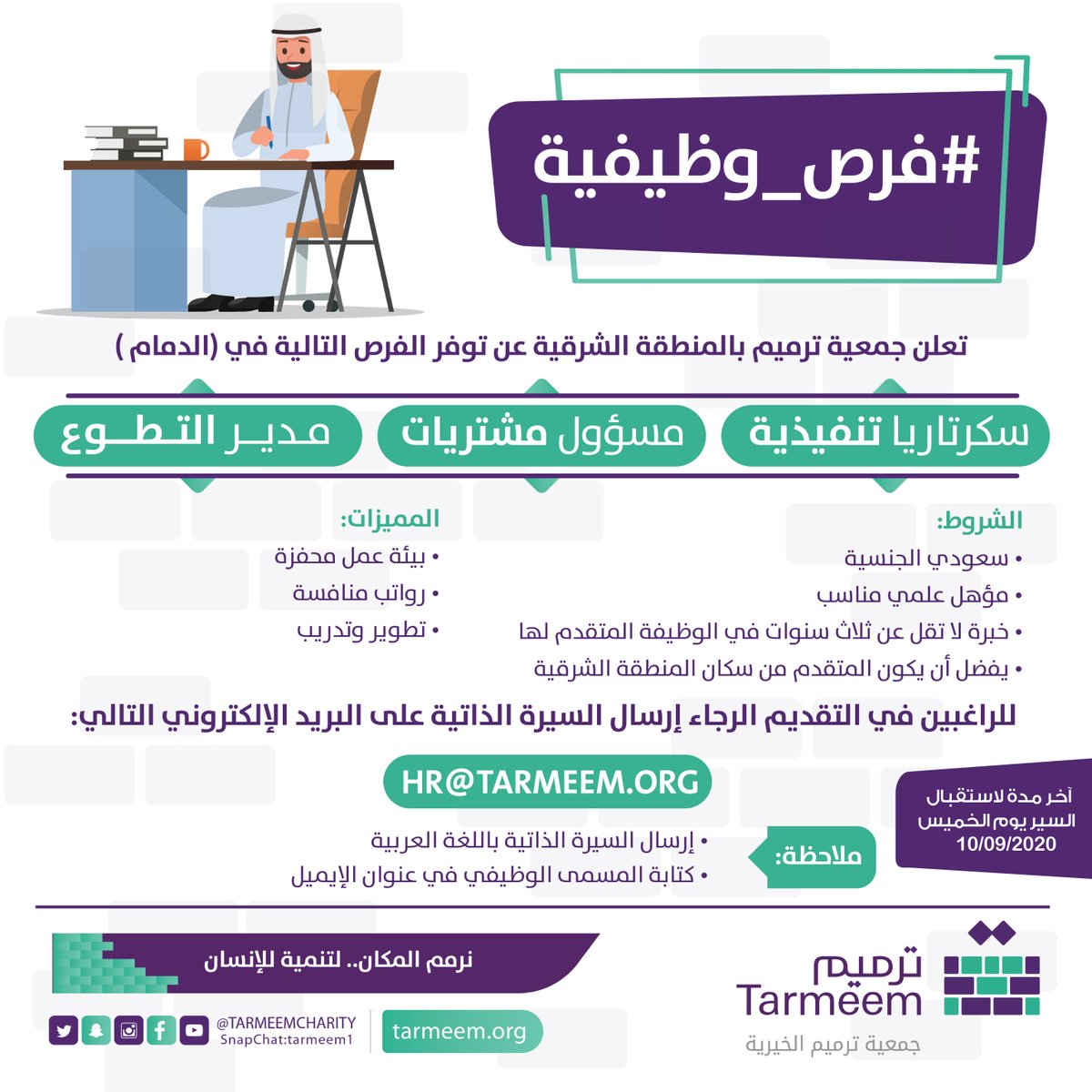 أعلنت جمعية ترميم الخيرية بالمنطقة الشرقية توفر 4 وظائف شاغرة للعمل بالمسميات التالية (أخصائي تسويق، وسكرتاريا تنفيذية، ومسؤول مشتريات، ومدير التطوع)، وذلك وفقاً لبقية التفاصيل الموضحة أدناه.