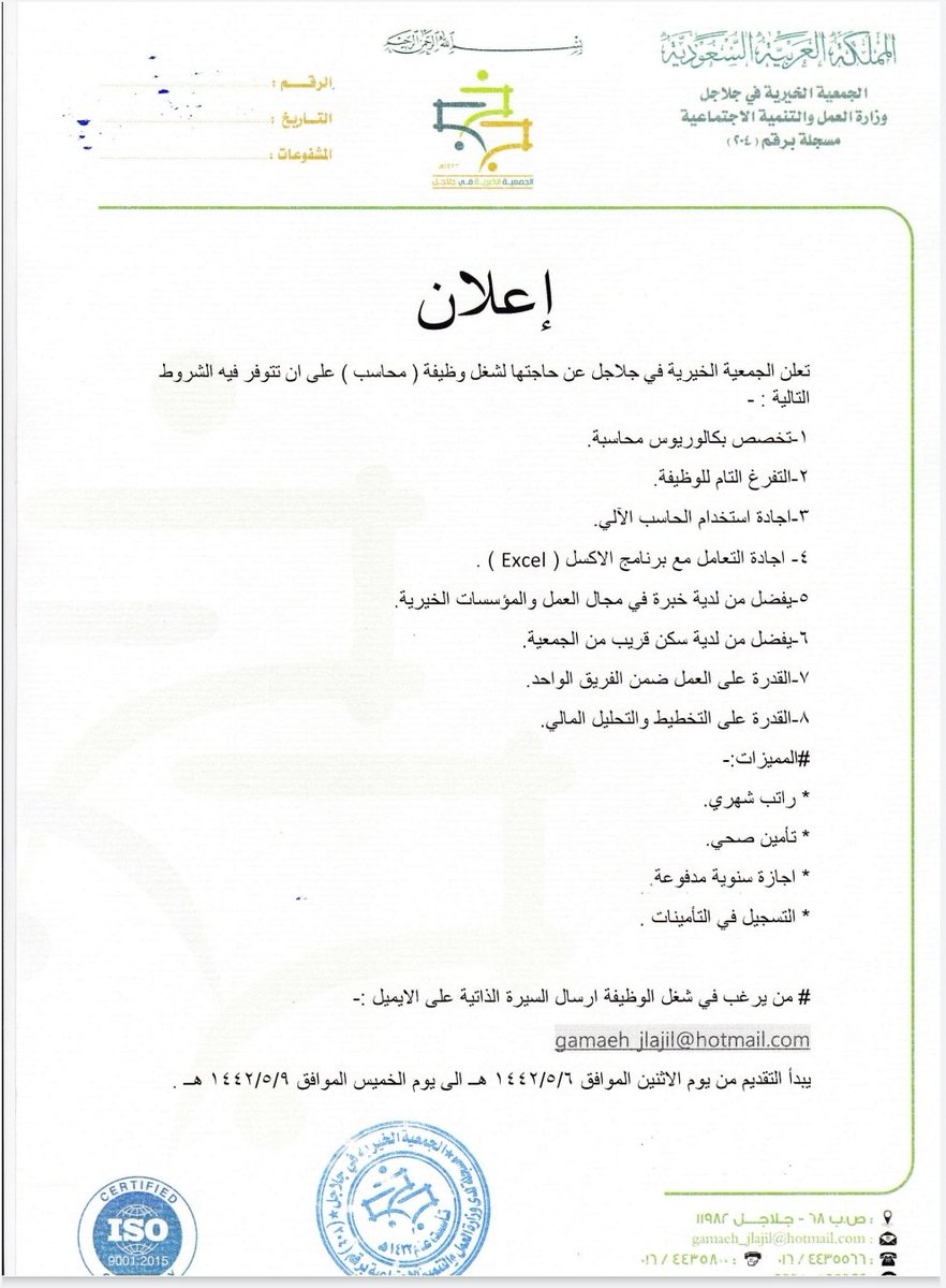 الجمعية الخيرية في جلاجل توفر وظيفة إدارية شاغرة لحملة البكالوريوس