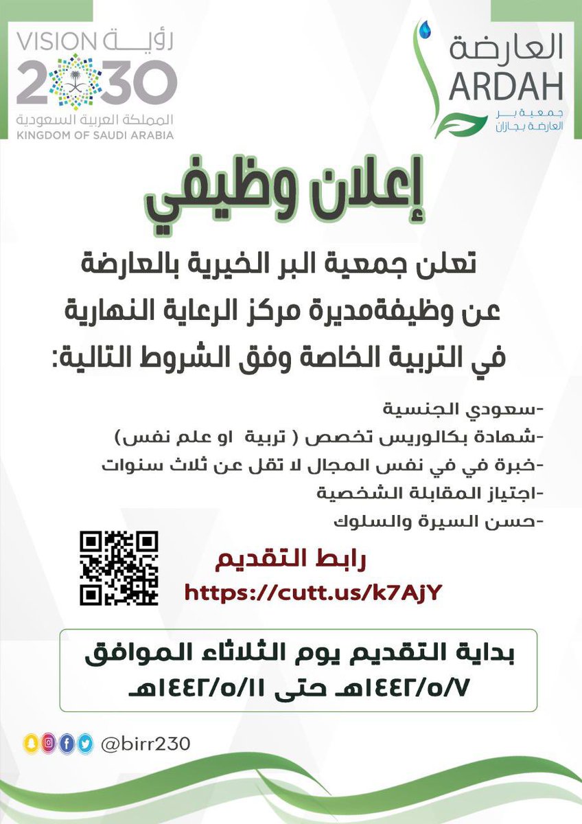 أعلنت جمعية البر الخيرية بالعارضة بجازان توفر وظيفة شاغرة لحملة البكالوريوس، للعمل بمسمى (مديرة مركز الرعاية النهارية في التربية الخاصة)، واشترطت الجمعية أن تكون المتقدمة سعودية الجنسية، وذلك وفقاً للتفاصيل وطريقة التقديم الموضحة أدناه.