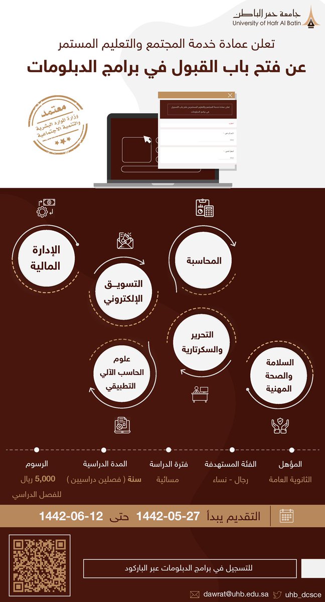أعلنت جامعة حفر الباطن مُمثلة في عمادة خدمة المجتمع والتعليم المستمر فتح باب القبول (للجنسين) في برامج الدبلوم لحملة الثانوية العامة، وذلك وفقاً للتفاصيل الموضحة أدناه.